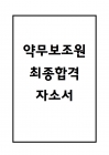 (약무보조원 자기소개서) 약무보조원 합격 자소서 약무보조원 인재상을 반영한 맞춤형 자기소개서입니다. 자소서 전문 컨설턴트와의 첨삭과 피드백을 거쳐 완성되었으며 단순히 읽기 좋은 글이 아니라 취업을 위..